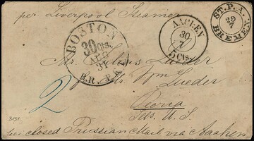(1857), K2 "ST.P.A. BREMEN" des Stadtpostamtes auf Damencouvert (unfrisch) mit ungewöhnlichem Leitweg über Aachen (statt Bremen) in die USA