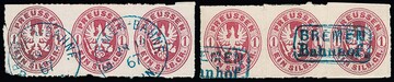 "Bremen Bahnhof", kleiner Ra2 bzw. neuer Grotesk-K1, je in blau, auf zwei Dreierstreifen Preußen 1 Sgr. (ein Wert Mgl.), dazu Brief 1 und 2 Sgr. mit schwarzem Ra2 "Bremen"