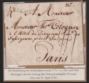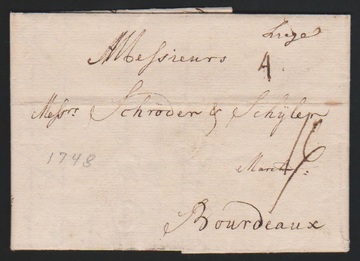 "Bremen", 1748, früher Auslandsbrief nach Bordeaux, vs. hs. Transit-Vermerk "Liege"