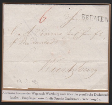 "Bremen", 1784, erster L1 in früher Verwendung auf Teilfranko-Brief nach Lienen, sowie zwei Briefe 1799/1801 mit späterem L1 je nach Würzburg