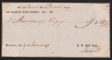 "Bremen", 1792/1806, zwei verschiedene Ortsdruck-Zeitungsscheine, "K. Reichs-Post-Amt" bzw. "K.R. Post-Amt"