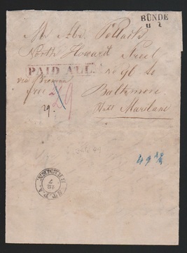 "Paid All", 1849, seltener roter Ra1 von Bremen auf Überseebrief mit Aufgabe-L2 "Bünde" via Bremen (rs. Stadtpost-K2) nach Baltimore, Taxe "49 1/2" Sgr., kleine Papiermgl. (teils behoben), Feuser 800,-