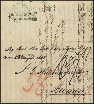 Incoming-Mail, 1848, "Mayaquez/Puerto Rico", seltener Brief mit rs. Rundstempel "San-Juan-Port" nach Bremen (diverse Taxen)