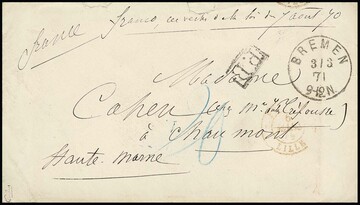 "Bremerhaven", 1870, K1 auf seltenem Feldpostbrief der Bremer Truppen im Krieg gegen Frankreich, an das 1. Hanseatische Inf.-Rgt., "Kriegsschauplatz jetzt vor Metz", fleckig, aber nur wenige Belege der hanseatischen Truppen bekannt!
