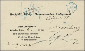 "Bremen", 1864, seltener blauer hannöv. Zier-K2 (mit Sternen) auf dekor. Vordruck-Streifband (Nachnahme) nach Nienburg