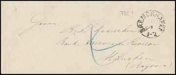 "Bremerhafen", nachverw. Hannover-K2 vom 1.1.1868, dem Ersttag des NDP, auf mit "7" Kr. nachtaxiertem Damencouvert nach München mit rs. Ankunftsstempel