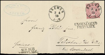 "Bremen", K1 1870 auf Faltbrief mit NDP 1 Gr. nach Tetschen/Böhmen, L2 "Ungenügend frankirt" und "Aus der Brieflade", jedoch nicht nachtaxiert, kleine Mängel, kurios eine bereits vorfrankierte Marke vor Abstempelung entfernt