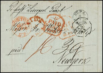 "ST.P.A. BREMEN", 1843/48/55, je K2 auf drei Überseebriefen nach Richmond, Petersburg bzw. New York, je USA, einmal Drucksache mit vs. vier verschiedenen roten Transit-Stempeln, ersterer seltener Laufweg via Aachen