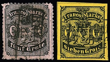 7 Gr. schw./gelb, breitrandig, und 5 Gr. schw./rosa, zwei optisch gute gestempelte Werte mit kleinen Mängeln, je Fotoexp. Neumann. Mi. 1300,-