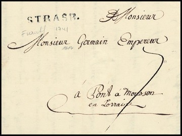 1741, L1 "STRASB." auf interessantem Forwardedbrief aus Frankfurt nach Pont á Mousson