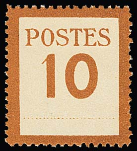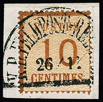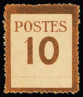 10 C. ockerbraun, das sehr seltene Essay in abweichender Zeichnung und ohne Netz-Unterdruck, wie zu Vorlagezwecken hergestellt ohne Gummi, in tadelloser Erhaltung. Seltenheit dieses Gebietes!