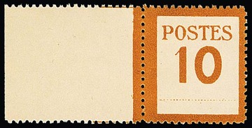 10 C. ockerbraun, sog. "Essay" in abweichender Zeichnung und ohne Netzunterdruck, wie zu Vorlagezwecken hergestellt, als breites linkes Randstück, wie verausgabt ohne Gummi