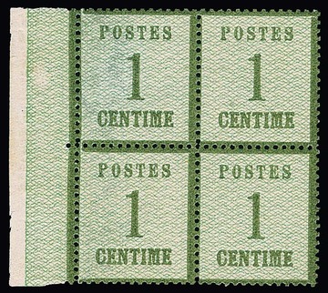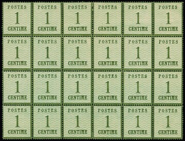 1 C. olivgrün im ungebrauchten 24er-Block, davon neun Marken Falzreste, 15 dagegen postfrisch, obere Reihe leichte Gummiknitter und einmal in der Zähnung gering angetrennt. Mi. der losen Marken 2580,-, als so große Einheit selten! Attest Mehlmann