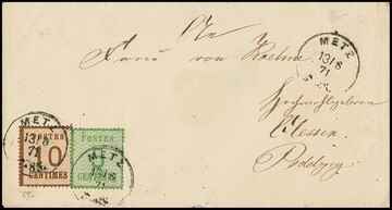 5 C. hellgelblichgrün, gute Variante mit Spitzen nach unten, rechts ein kurzer Zahn, sonst gut, nebst 10 C. ockerbraun auf Damencouvert (rs. ein Klappenteil verkürzt, mit Inhalt) von Metz 1871 nach Podelzig. Mi. 1300,-
