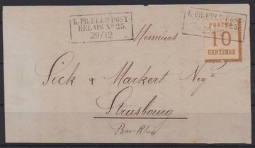 10 C. ockerbraun, mit deutlichem Plattenfehler unten, auf Briefvs. mit besserer Entwertung durch Ra3 "K. Pr. Feld-Post Relais No. 25"