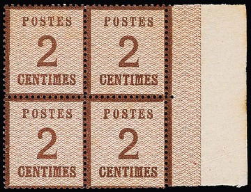 2 C. rotbraun, Spitzen nach unten, im postfrischen Rand-Viererblock, die rechte untere Marke kleine Zahnfehler, die drei anderen tadellosen schon lose 660,- Michel