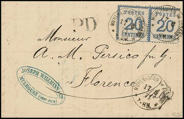 20 C. blau, Prachtpaar (re. Marke ein min. verkürzter Zahn) auf seltenem Auslandsbrief von Mühlhausen (K1) 1871 nach Florenz/Italien, sign. Calves