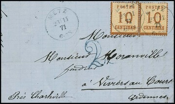 10 C. ocker, gute Farbe, im waagerechten Paar (linke Marke ganz winzge Rauhung) auf Faltbrief in Doppelfrankatur mit blauem Taxstempel "25", fünfte Periode, von Metz, 23.11.71, nach Veviers au Court. Mi. für diese Nuance "-.-" (lose 400,-), Fotoexp. Mehlmann