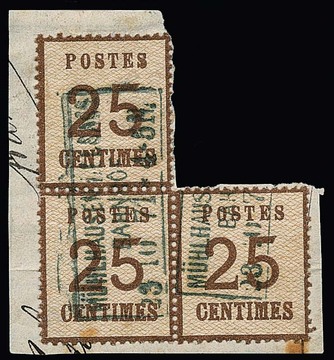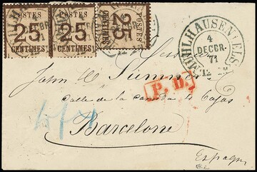 25 C. dunkelbraun per drei (mittlere Marke oben ein Fehlzahn) auf Damencouvert (rs. fehlt die obere Viertelklappe) mit HE "Mühlhausen i. Els.", 4. Dez. 1871, nach Barcelona/Spanien. Für dieses Gebiet seltene Destination und dekorativer kleiner Brief, rs. alter Einkaufsvermerk von Stuckert aus den 40er Jahren