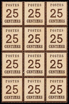 25 C. dunkelockerbraun im postfrischen (!) Zwölferblock, zwei Werte ganz minimale Tönungsstellen im Gummi, jeder Wert gut sign. Blecher. Mi. lose 2400,- ++