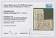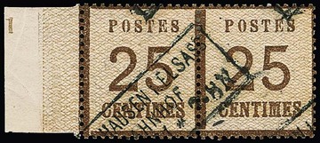 25 C. braun, Kabinettpaar mit 13,5mm breitem linkem Bogenrand (dieser etwas bügig) mit Ra3 von Mühlhausen/Bahnhof, im Rand sehr seltene Plattennummer "1", die mir gebraucht erstmalig vorliegt. Sign. Flemming