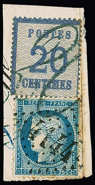 20 C. blau, zwei Briefstücke je in Mischfrankatur mit Frankreich 20 bzw. 25 C. Ceres, je seltene Entwertung der Elsaß-Marken durch französ. Punktstempel bzw. Taxstempel "20", kl. Mgl.