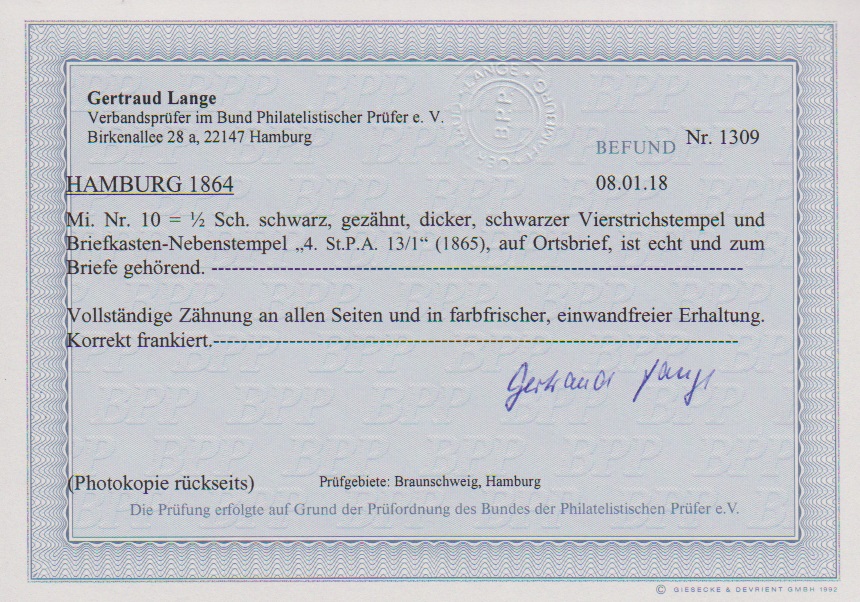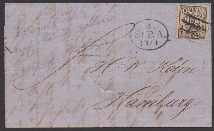 1/2 Sch. schwarz einzeln auf gef. Pracht-Ortsbrief mit Briefkasten-Nebenstempel "4. St.P.A." 1865, Fotoexp. Lange
