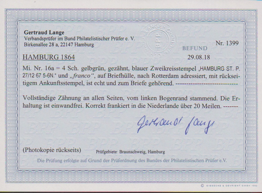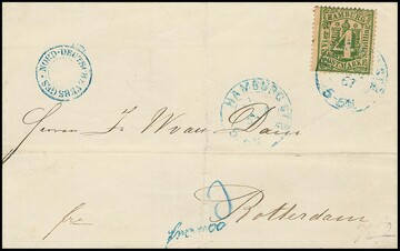 4 Sch. gelbgrün, tadellos auf Brief (ausserhalb der Frankatur gefaltet) von Hamburg 1867 nach Rotterdam/Holland, Fotoexp. Lange