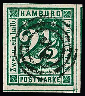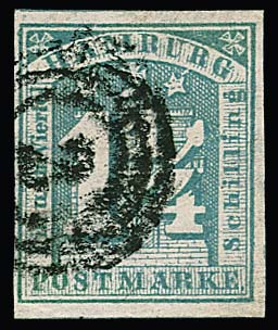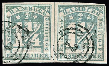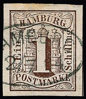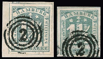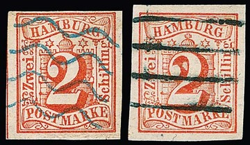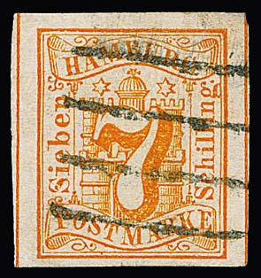 1 Sch. braun mit Hamburger Ovalstempel, sowie 7 Sch. orange, zwei sehr breitrandige Kabinettstücke, Mi. 190,-