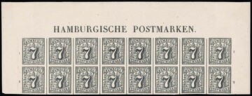 7 Sch. lilagrau, der Probedruck als wie verausgabt ungebrauchtes oberes Bogenteil zu 16 Exemplaren mit allen Rändern und oben Inschrift "Hamburgische Postmarken". Senkrechte Faltspur in der Mitte nur im Zwischenraum, die Marken tadellos. Eine dekorative und seltene Einheit, Attest Lange. Mi. lose Einzelmarken 4800,- ++