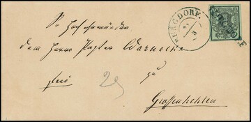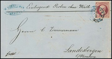 1 Ggr. schw./meergrün, frühe Auflage, auf Kabinettbrief 1855 mit übergehendem blauem L1 "Burgdorf", K2 nebengesetzt