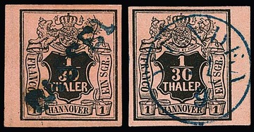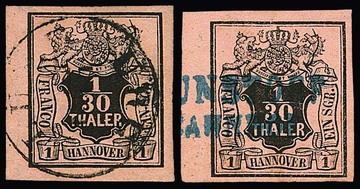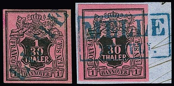 1/30 Th. schw./lachsfarben, zwei breitrandige Kabinettstücke mit schwarzen Stempeln, K2 "Lüneburg" (vom Rand) und L1, dazu weiteres Randstück mit L2 "Wunstorf Bahnhof", sign. Engel bzw. Bühler