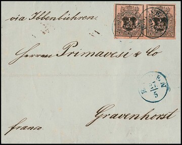 1/30 Th. schw./lachsfarben, tadelloses Paar auf Brief (dieser leichte Gebrauchsspuren wie Mittelfalte) mit K1 "Emden" an bekannte Adresse "Primavesi" in Gravenhorst. Dieser Ort zeichnet sich durch die Besonderheit aus, dass unterschiedliche Portosätze bei gleicher Korrespondenz, abhängig vom Transitpostamt (hier via Ibbenbühren und Rheine), möglich waren. Attest Jäschke-L. Mi. 800,-