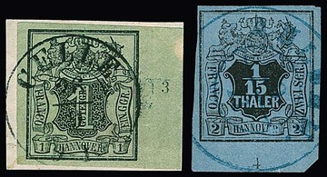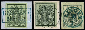 1 Ggr. schw./graugrün (2) und auf meergrün, drei Luxusstücke, vom Oberrand mit K1 "Lingen", sowie Briefstücke mit schwarzem K2 "Celle" bzw. blauem Ra2 "Bevensen"