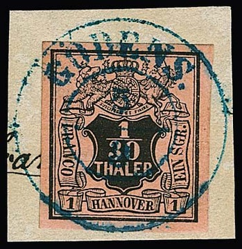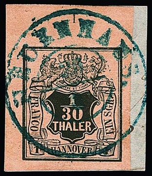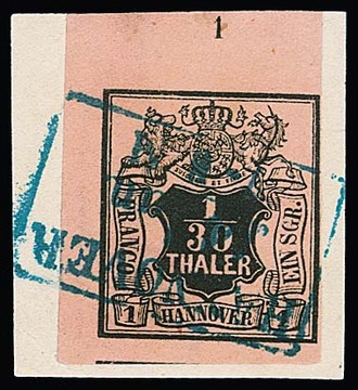 1/30 Th. schw./lachsfarben, linke obere Bogenecke mit Reihenzahl "1", allseits noch voll- bis überrandig, auf Kabinettbriefstück mit Ra3 von Hannover, sign. Grobe