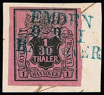1/30 Th. schw./himbeerrot auf Kabinettbriefstück mit hierauf nicht häufigem Bahnpost-L3 "Emden-Hannover", sign. Krause