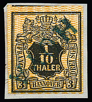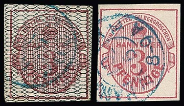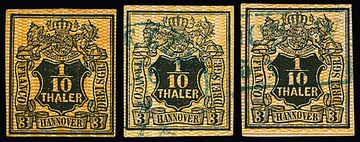 1/10 Th. schwarz, Netzwerk orange bzw. gelb, zwei Kabinettstücke, je sign. Engel, dazu die früher als Nr. 7c gelistete 1/10 Th. mit olivgelbem Netzwerk ungebr. (jetzt Nr. 7P), Mi. 720,-