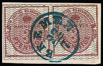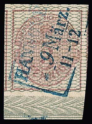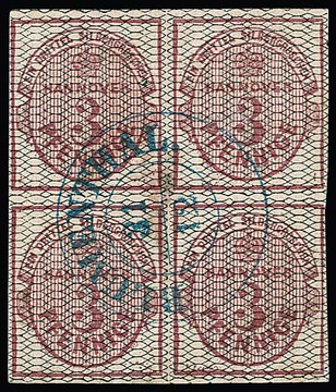 3 Pfge. karmin, schwarz genetzt, Kabinett-Viererblock mit K2 "Blumenthal" vom 31.12. Nur im weiten Überrand ausserhalb kleine Schürfstelle = kein Mangel. Eine seltene Einheit aus der Reitmeister-Sammlung (16. Köhler). Mi. 2000,-, Attest Berger "einwandfrei"