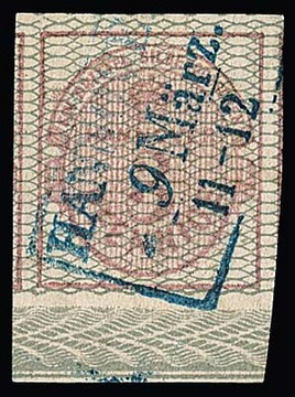 3 Pfge. karmin, schwarzes Netzwerk, links unten etwas "Lupenrand", rechts mit Bordüren-Bogenrand und Reihenzahl "4", auf Prachtbriefstück mit zentrischem K2 "Hildesheim", sign. Ebel u.a.