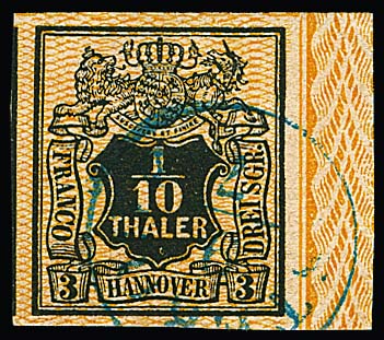 1/10 Th. schwarz, orange genetzt, ungebrauchtes Prachtstück (nur im Oberrand kleine Aufspaltung) mit vollem Originalgummi in unterschiedlich dicker Auftragung (dadurch nach links hin dunkler), eine seltene Marke, sign. Bühler. Mi. 800,-