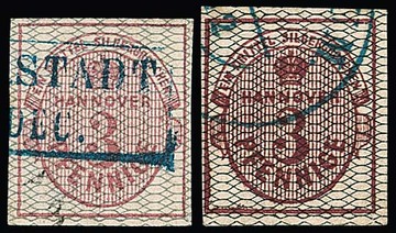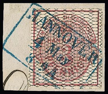 3 Pfge. karmin, schwarz genetzt, auf Kabinettbriefstück mit Ra3 "Hannover", sign. Engel, Krause. Mi. 320,-