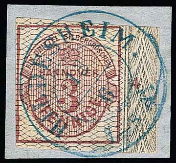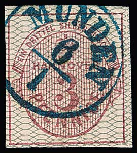 3 Pfge. karmin, grau genetzt, Kabinettstück mit zentrischem K1 "Münden", sign. Krause. Mi. 450,-