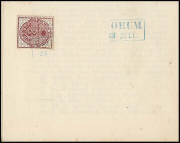 3 Pfge. karmin, schwarz genetzt, Kabinettstück mit gut sichtbarem Plattenfehler "rechte obere Bildecke abgeschrägt", auf Drucksache (ohne Schleife) mit Ra2 "Dornum", Attest Jäschke-L. Mi. 2000,-