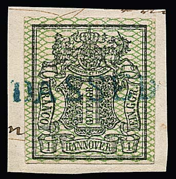 1 Ggr. schw./grün, aussergewöhnlicher Luxus-Schnittriese auf kleinem Briefstück mit K1 "Lüneburg", oben vom Bordüren-Bogenrand, alle anderen Seiten Nebenmarken! Sign. Ressel u.a.