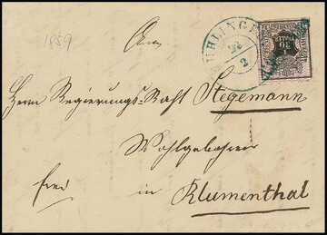 1/30 Th. schw./rosa, allseits voll- bis breitrandig, auf Kabinettbrief mit Vorausentwertung durch blauen L1 "Suhlingen", der Neben-K2 auf die Marke übergehend