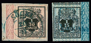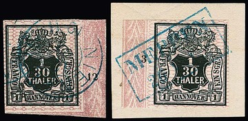 1/30 Th. schw./rosa mit Bordüre und Reihenzahl "6" links auf Kabinettbriefstück mit K2 "Sögel", sowie 1/15 Th. schw./blau als weit überrandiges rechtes Bordüren-Randstück