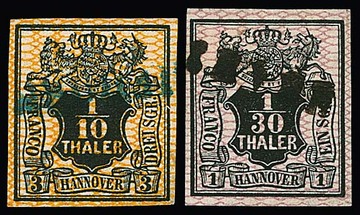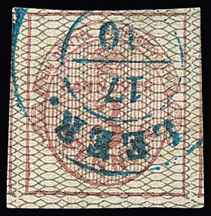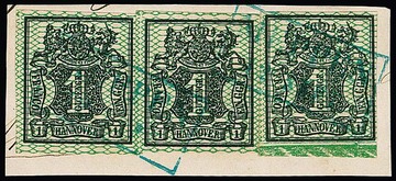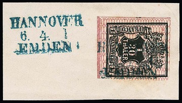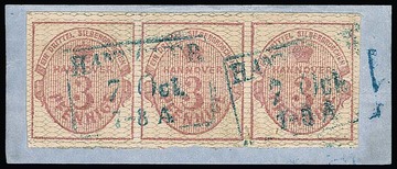 3 Pfge. karmin, grau genetzt, allseits breitrandiger waagerechter Dreierstreifen auf Briefstück mit Ra3 von Hannover. Die Marken sind einwandfrei, lediglich zwischen erster und zweiter Marke Bugspur im Zwischenraum. Aus der "Romanow"-Sammlung (Zuschlag Kruschel 1975 DM 1400,-), sign. Ebel, Drahn, Moser-Räz, sowie Attest Berger. Mi. 1800,-