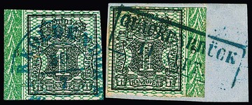 1 Ggr. schw./grün, senkrechter Kabinett-Dreierstreifen, ferner per drei auf Kabinettbriefstück mit Ra2 "Meppen", sowie zwei Paare senkrecht und waagerecht, sign. Engel, Kruschel. Mi. 465,-