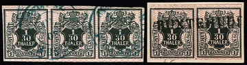 1/30 Th. schw./rosa, sehr frischer Pracht-Dreierstreifen, sign. Engel, sowie im Paar (links min. Randlinienschnitt) auf Briefstück mit schwarzem L1 "Buxtehude"