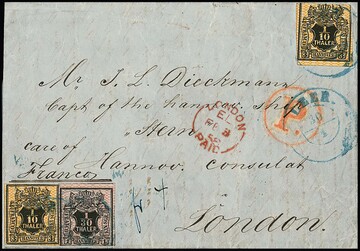 1/30 Th. schw./rosa und zweimal 1/10 Th. schw./orange, typisch teils etwas berührt bzw. einmal angeschnitten, als vollständige 7-Sgr.-Frankatur auf Auslandsbrief (mit Inhalt) 1858 von Leer an einen Schiffskapitän ("Stern") über die Adresse des Hannoverschen Konsulat in London (zur Weiterbeförderung, u.a. nach Übersee), interessanter Brief in völlig ursprünglicher Erhaltung